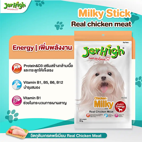 تشویقی میلکی که از گوشت مرغ درجه یک تهیه شده است که باعث افرایش سطح انرژی سگ شما میشود و همچنین به دلیل دارا بودن پروتئین و ویتامین دی 3 موجود در تشویقی، ماهیچه ها و استخوان ها را تقویت میکند تا سگ شما پاهای قوی تری داشته باشد و همچنین ویتامین های B1، B5، B6،B12 مغز سگ شما را تقویت میکند و ویتامین B1 موجود به فرآیند متابولیسم کمک می کند