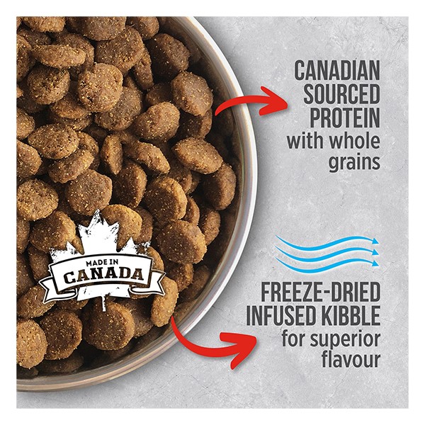 میوه ها که خواص آنتی اکسیدانی و فیتونوترینت غنی هستند.یک ترکیب گیاهی خاص و روغن نارگیل به دلیل توانایی آنها در ارائه مزایای سلامتی متعدد استفاده می شود.روغن سالمون به عنوان منبع اصلی اسیدهای چرب امگا 3 DHA و EPA برای تضمین سلامت پوست و پوشش استفاده می شود.پری بیوتیک ها و پروبیوتیک های قدرتمند جذب بیشتر مواد مغذی را فراهم می کنند و دستگاه گوارش سالم تری را تقویت می کنند، در حالی که افزایش سطح گلوکزامین و کندرویتین محافظت پیشرفته ای از مفصل ران و مفصل را ارائه می دهد. ترکیبات : گوشت گاو بدون استخوان، کنجاله خوک، جو دو سر بریده شده فولادی، جو مروارید، نخود سبز، عدس قرمز، چربی گوشت خوک، آرد بره، طعم طبیعی گوشت خوک، کنجاله یونجه خشک شده در آفتاب، جگر گاو خشک شده منجمد، روغن ماهی قزل آلا، روغن نارگیل، کربنات کلسیم، کدو تنبل، کدو حلوایی، هویج، اسفناج، کلم بروکلی، سیب، زغال اخته، زغال اخته، انار، عصاره درخت عرعر، زنجبیل، رازیانه، بابونه، برگ نعناع، ریشه شیرین بیان، زردچوبه، ویتامین ها (مکمل ویتامین E، مکمل ویتامین A، نیاسین، کلسیم) پانتوتنات، ریبوفلاوین، پیریدوکسین هیدروکلراید، تیامین مونونیترات، بیوتین، مکمل ویتامین B12، مکمل ویتامین D3، اسید فولیک)، مواد معدنی (سولفات روی، پروتئینات روی، پروتئینات آهن، سولفات آهن، پروتئینات مس، سولفات مس، پروتئین اکسید منگنز، منگنز یدات کلسیم، سلنیت سدیم)، کلرید پتاسیم، نمک، لسیتین، کلرید کولین، عصاره ریشه کاسنی، عصاره مخمر، DL-متیونین، ال-لیزین، گلوکزامین هیدروکلراید، کندرویتین سولفات، عصاره رزماری، محصول خشک شده لاکوزیتوسیل محصول تخمیر، محصول تخمیر خشک بیفیدوباکتریوم بیفیدوم، محصول تخمیر خشک شده انتروکوکوس فاسیوم.