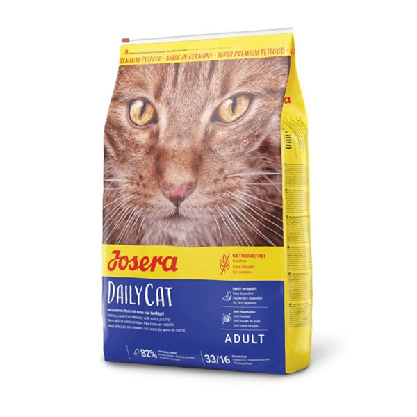 آیا گربه شما عاشق مرغ است و رژیم بدون غلات را ترجیح میدهد؟ غذای خشک گربه جوسرا مدل دیلی کت با کیفیت سوپر پریمیوم برای تغذیه روزانه گربه های بالغ داخل خانه و خارج خانه که به غلات حساس هستند و مرغ را ترجیح میدهند مناسب است.کمک به هضم آسان و خاصیت آنتی هربال که دارای ترکیبات: پروتیین مرغ خشک سیب زمینی خشک، آرد نخود، چربی طیور، فیبر چغندر، پروتیین حیوانی هیدرولیزه شده، جگز طیور هیدرولیزه شده، گیاهان و میوه ها و مواد معدنی می باشد.