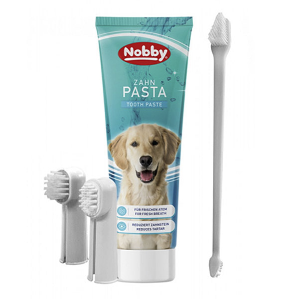 مجموعه مسواک از خمیر دندان نعنایی و یک مسواک 2 سر، یک مسواک یاب و یک برس ماساژ انگشتی تشکیل شده است. برای همه سگ ها مناسب است و دندان های سالمی دارد.
