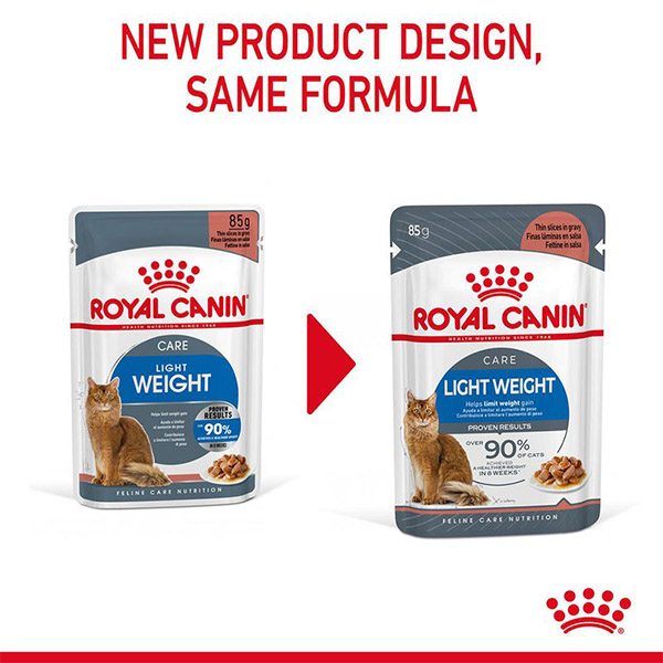 غذای پوچ کاهش وزن اولترا لایت ویت رویال کنین برای گربه های بالغ همه نژادها قابل استفاده است. این محصول 19% کالری کمتری دارد.
